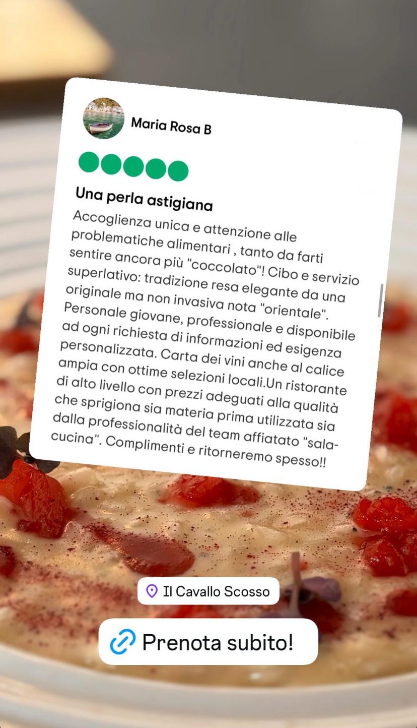 Ma non è tutto: al Cavallo Scosso garantiamo sempre il tuo tavolo esclusivo, senza sgradevoli vincoli di turni o orari imposti, come spesso accadde in molti ristoranti. Vogliamo che tu possa goderti pienamente la tua esperienza senza fretta, con il tavolo riservato solo per te.