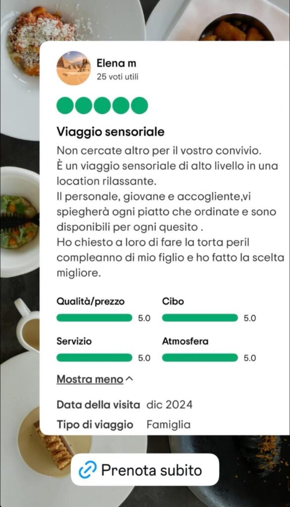 Le “Experience” sono perfette sia come regalo per una persona speciale, che, come occasione per esplorare la nostra cucina con una proposta “All Inclusive”, garantendoti un momento unico e indimenticabile.